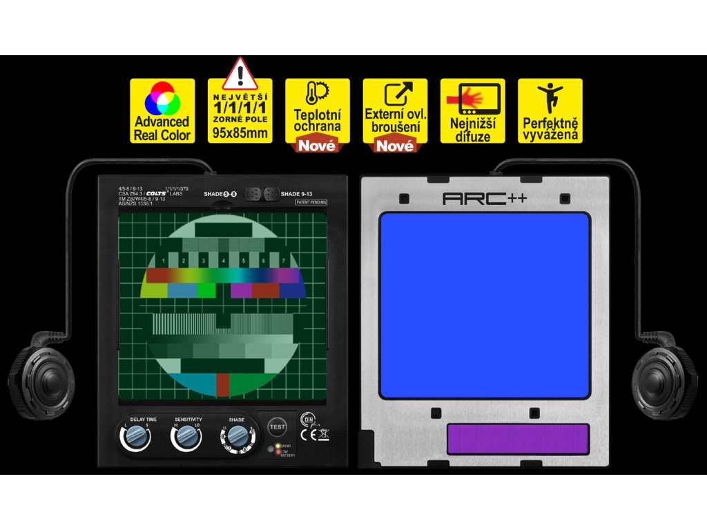 - Plynule nastaviteľná clona s tmavým filtrom (pri zváraní) 5-8, 8-13 DIN ovládaná interne pomocou potenciometra.
